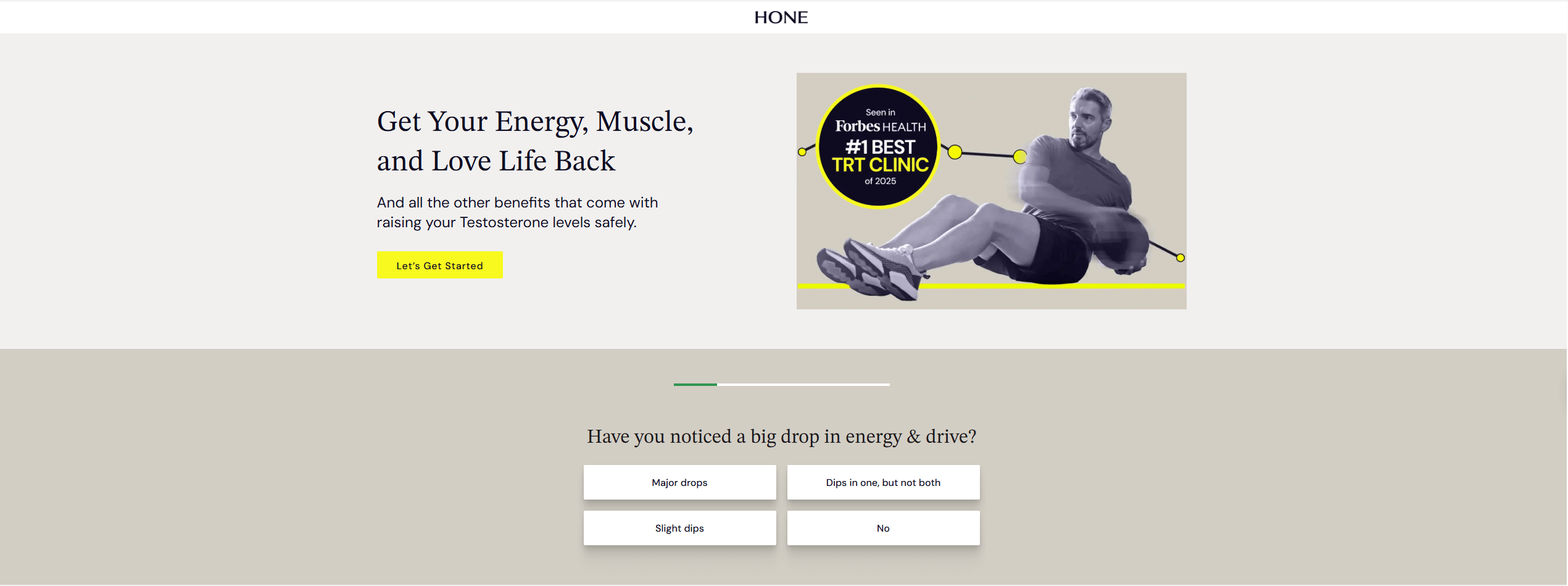 Hone is more than just a way to treat low T symptoms; it wants to improve your overall healthspan. Hone helps you find the root causes of your symptoms so you can make deeper, longer-lasting changes in your energy, mood, and physical performance. It does this by doing advanced lab work and offering support for related issues like thyroid health and metabolism.